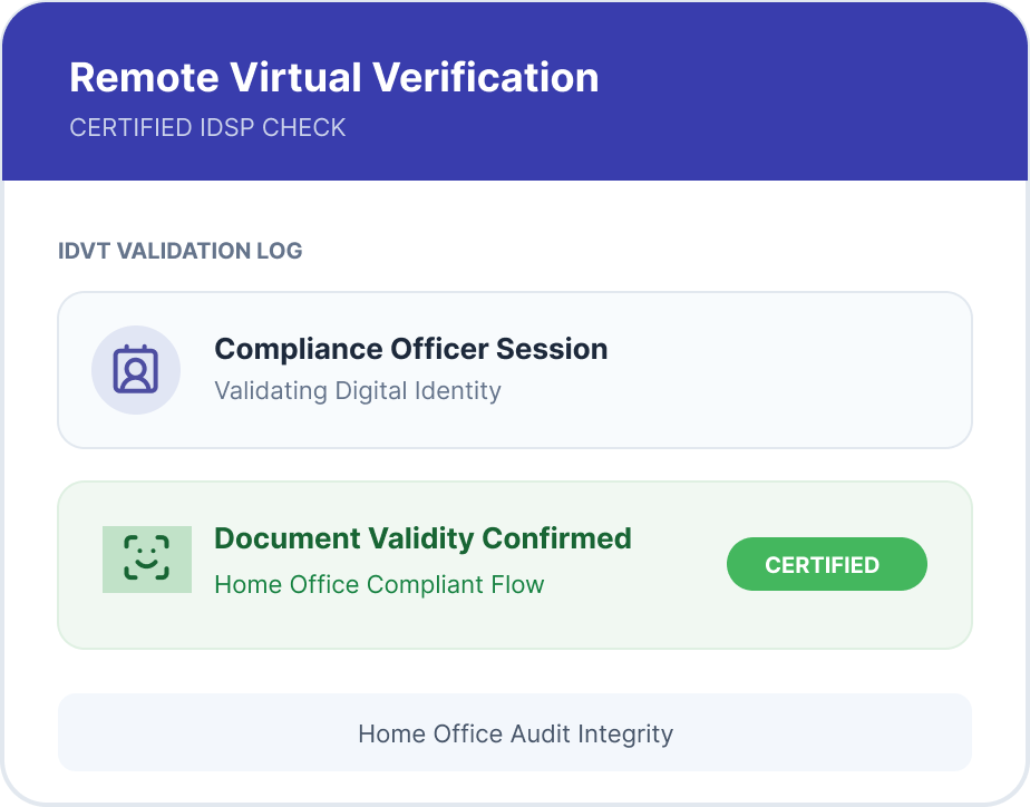 IDSP-aligned digital identity verification and structured support for in-person checks where required.