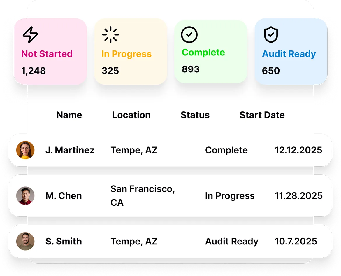 Automated scheduling, retention tracking, and status visibility to prevent missed deadlines and procedural violations. I-9 completion becomes consistent across locations, teams, and hiring volumes