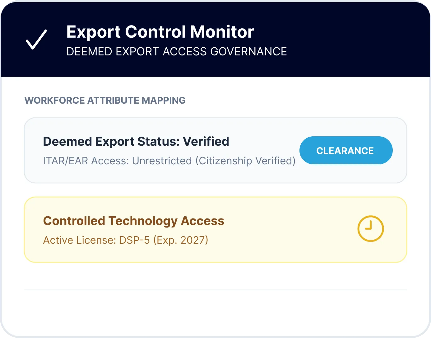 Workforce-based export control compliance for ITAR, EAR, and controlled technology environments.